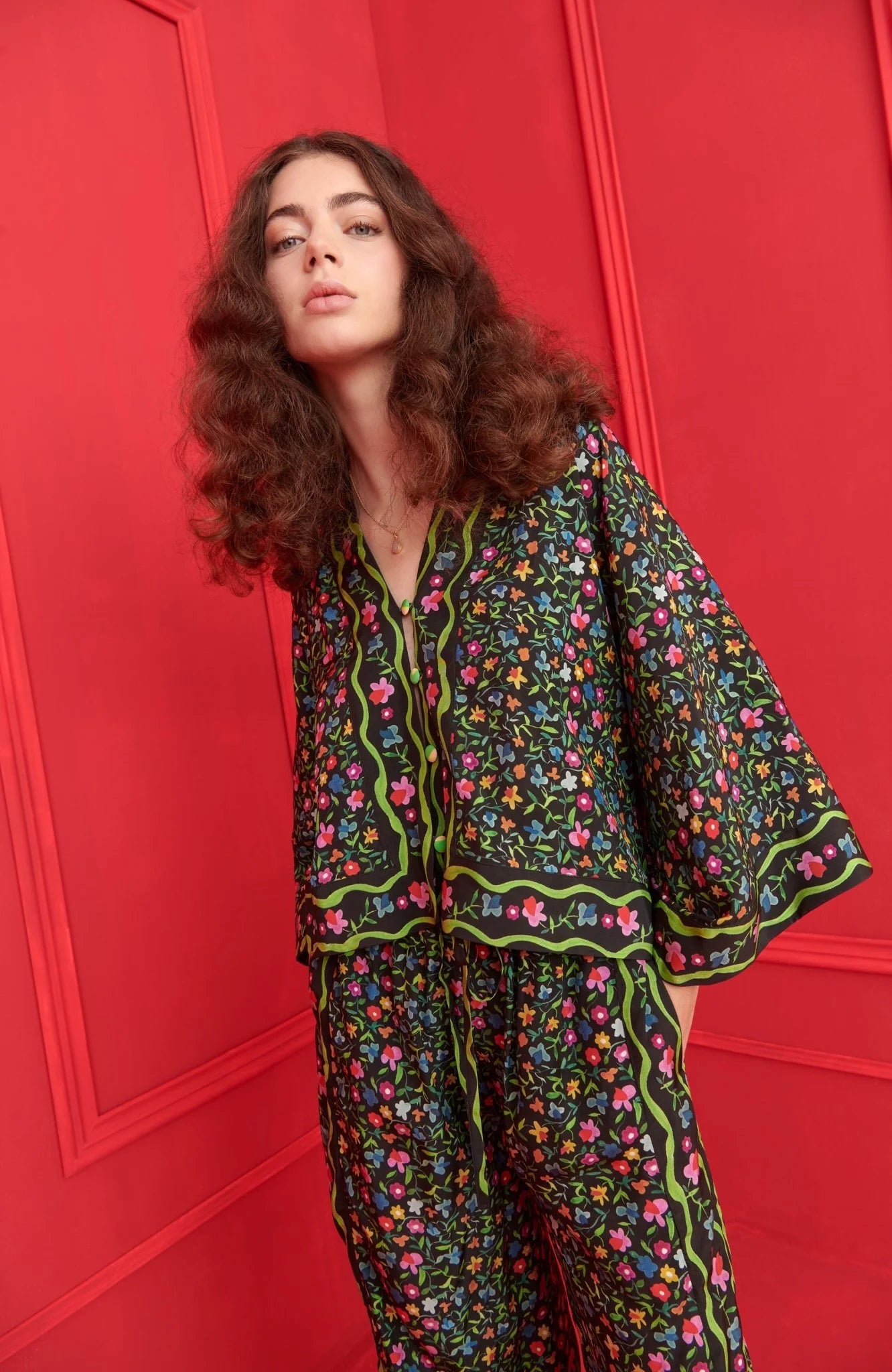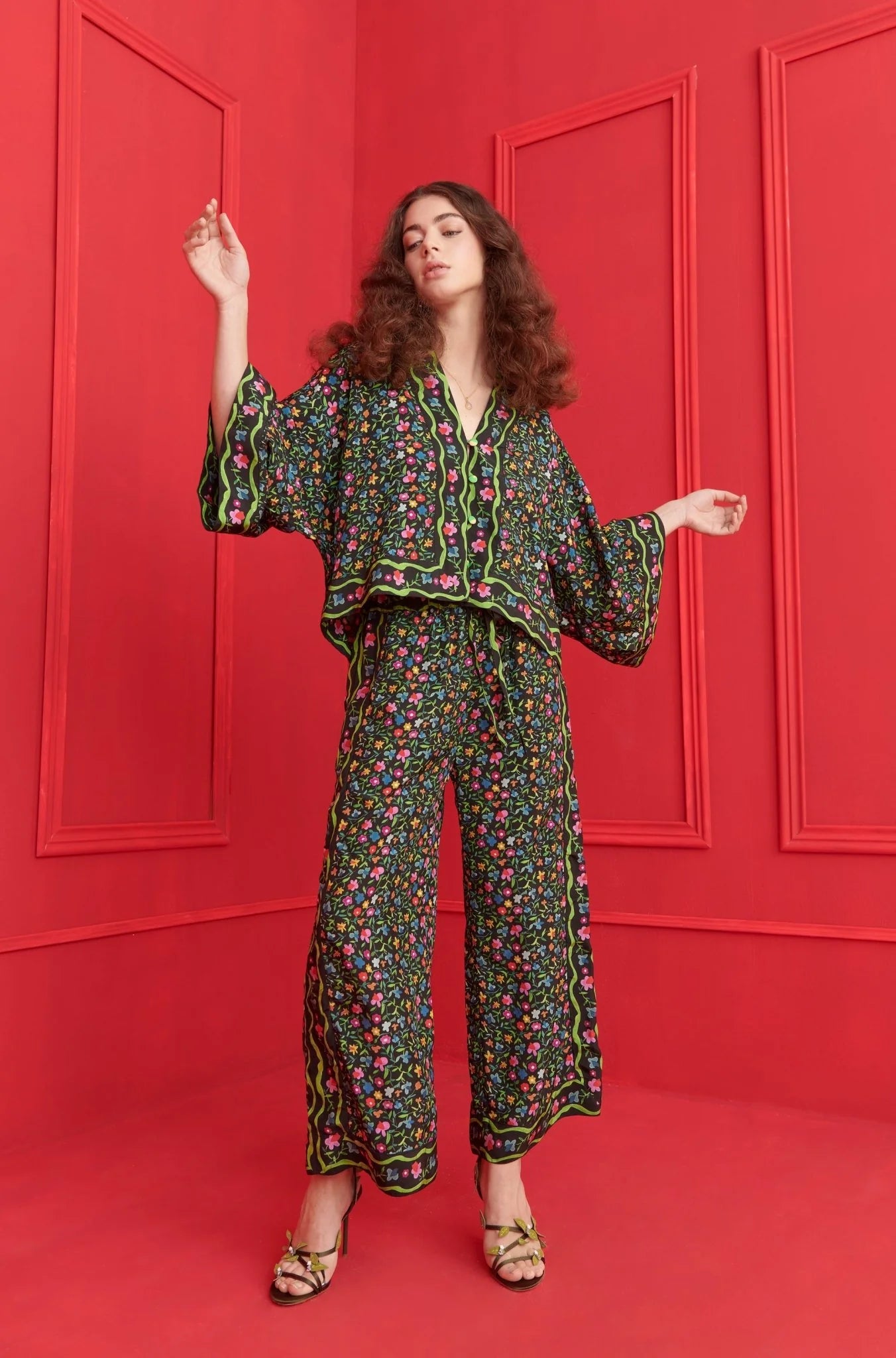 Bold yet breezy, the Hala Pants are designed for effortless elegance. With a loose, wide-leg cut and an elasticated waist, they offer comfort without compromising on style. The vibrant all-over floral motif is framed by striking green piping over a midnight-black base for a refined finish. They also feature side pockets for added functionality. Perfect as a set or styled solo.