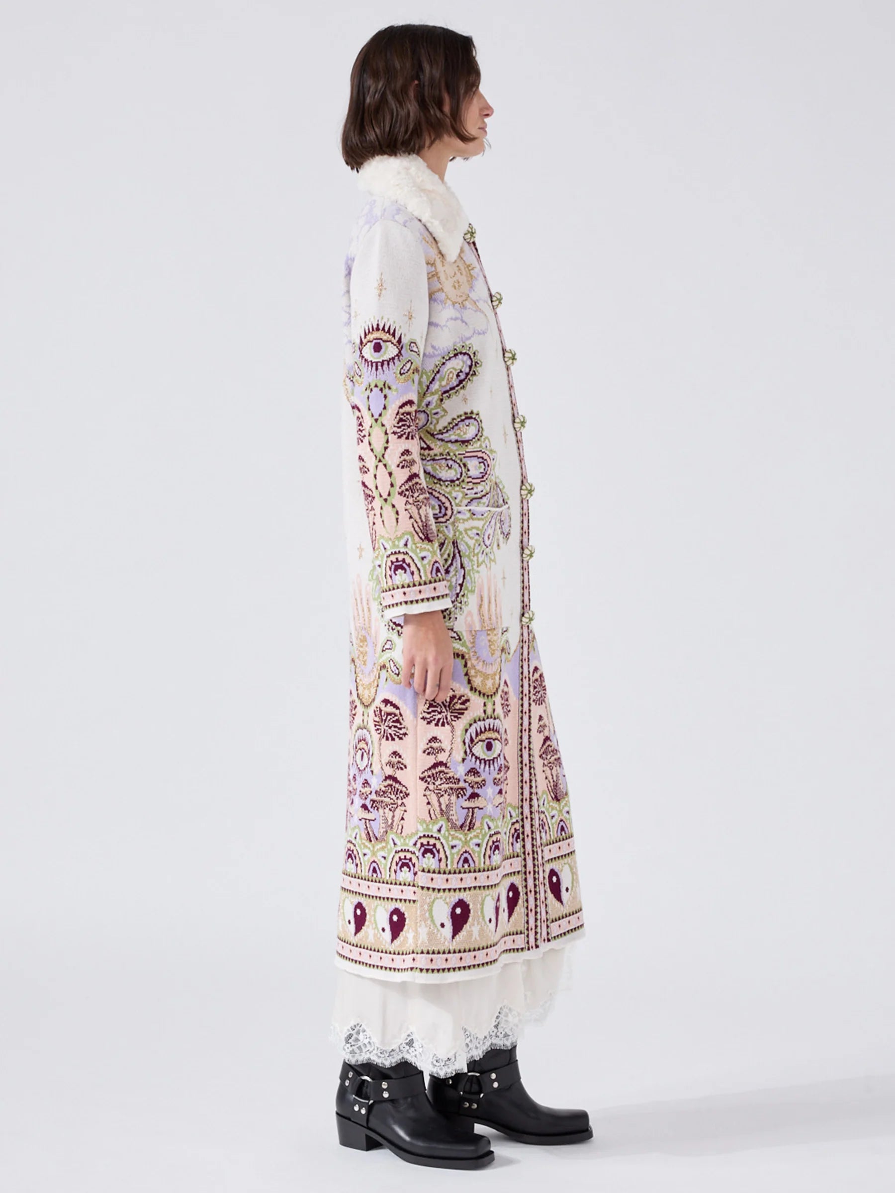Inspired by exploration and global cultures, this signature knitted coat features our hand-painted Written in the Stars design - a tapestry of eyes, hands, stars and florals, woven into a rich metallic jacquard. Finished with a plush faux fur collar for texture and warmth, it’s a versatile companion for life’s greatest adventures. Just add jeans.