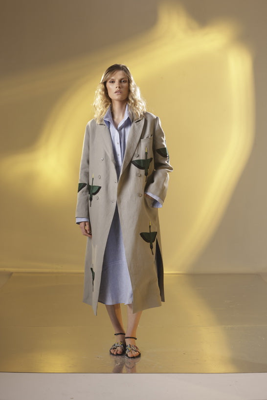 معطف مزدوج الصدر ذو قصة مريحة مع فتحات جانبية وتطريز على شكل طائر بالكامل، ويتم تطريز ما يلي من الداخل: