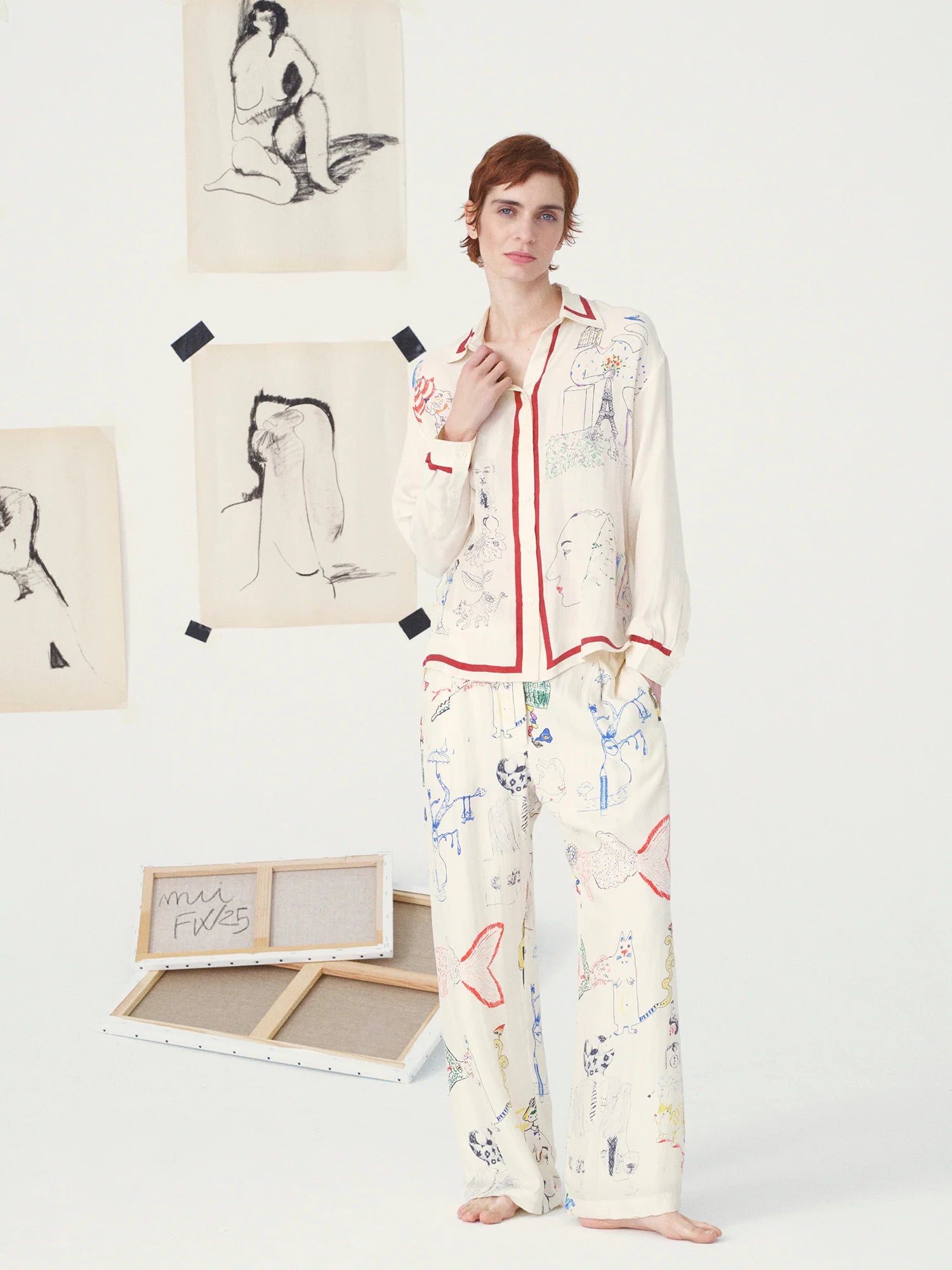 The Almaria shirt is part of the surrealist theme, evoked here by the exquisite corpse motif. Artist Bérengère Henin and her husband Anthony Peskine collaborated on this motif, which is the emblem of the season. Hand-printed on high-quality silk, a pretty red border enhances this print and adds a touch of style. Extremely comfortable, you can pair the shirt with the Apoline pants to create the complete look.