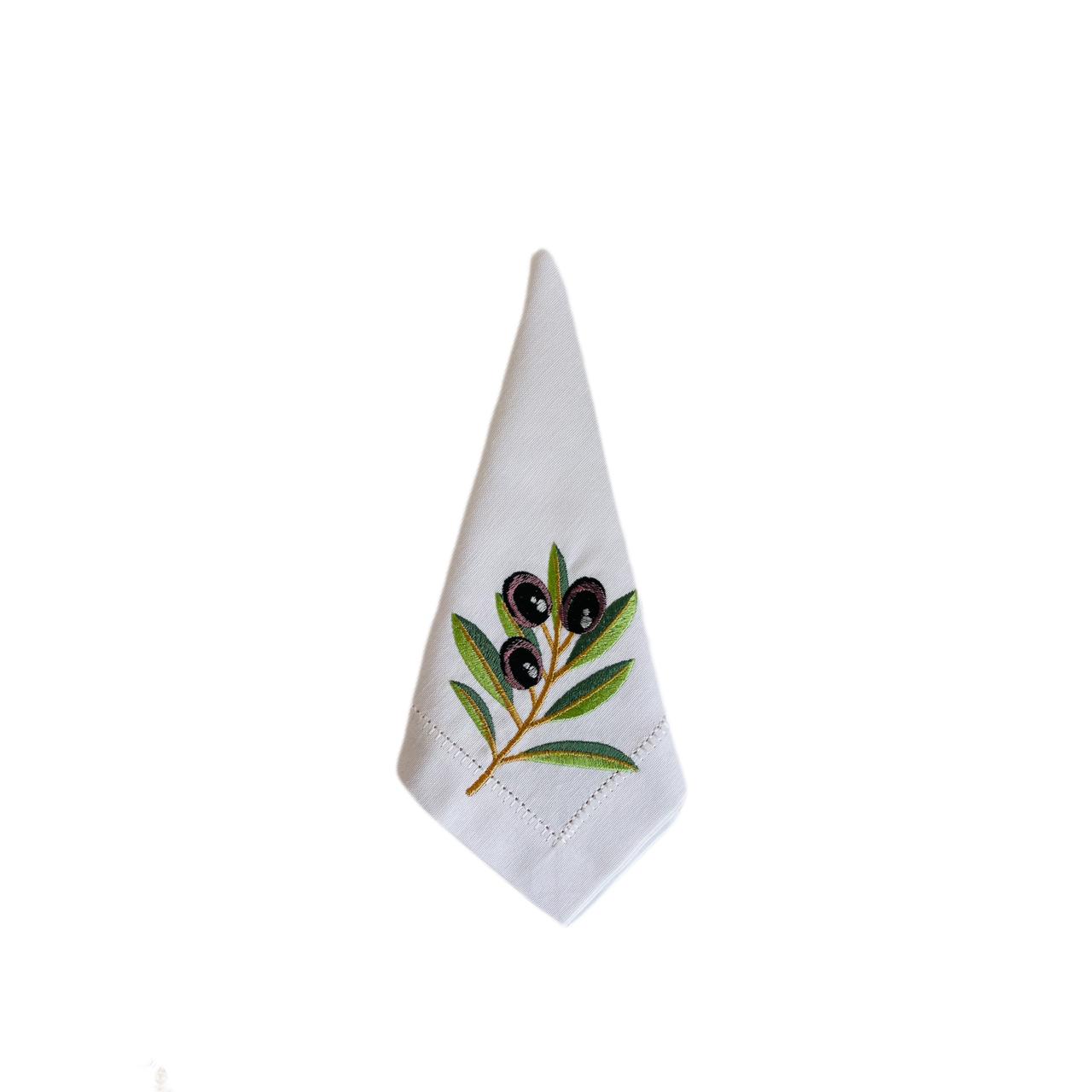 منديل كتان أبيض مقاوم للماء مع غصن زيتون مطرز باللونين الأسود والأخضر.