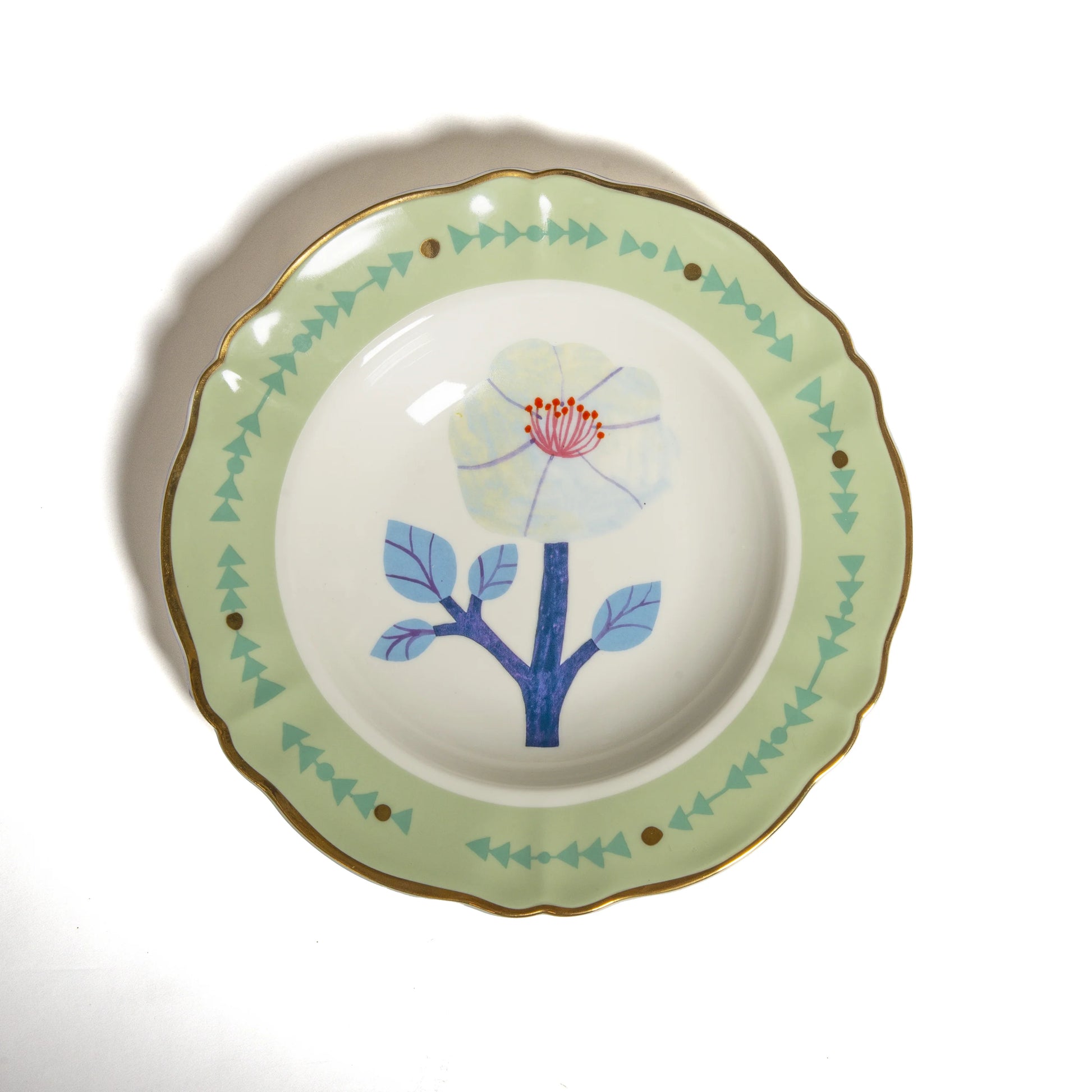Porcelain dishes with gold rim and decal - Dishwasher safe Max 250 washings - Not microwave safe
