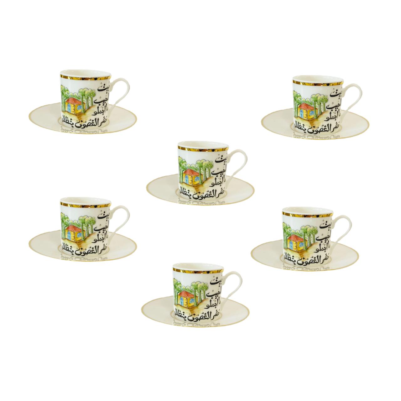 Coffee cup porcelain with house  and arabic calligraphy painting on the cup with golden rim: