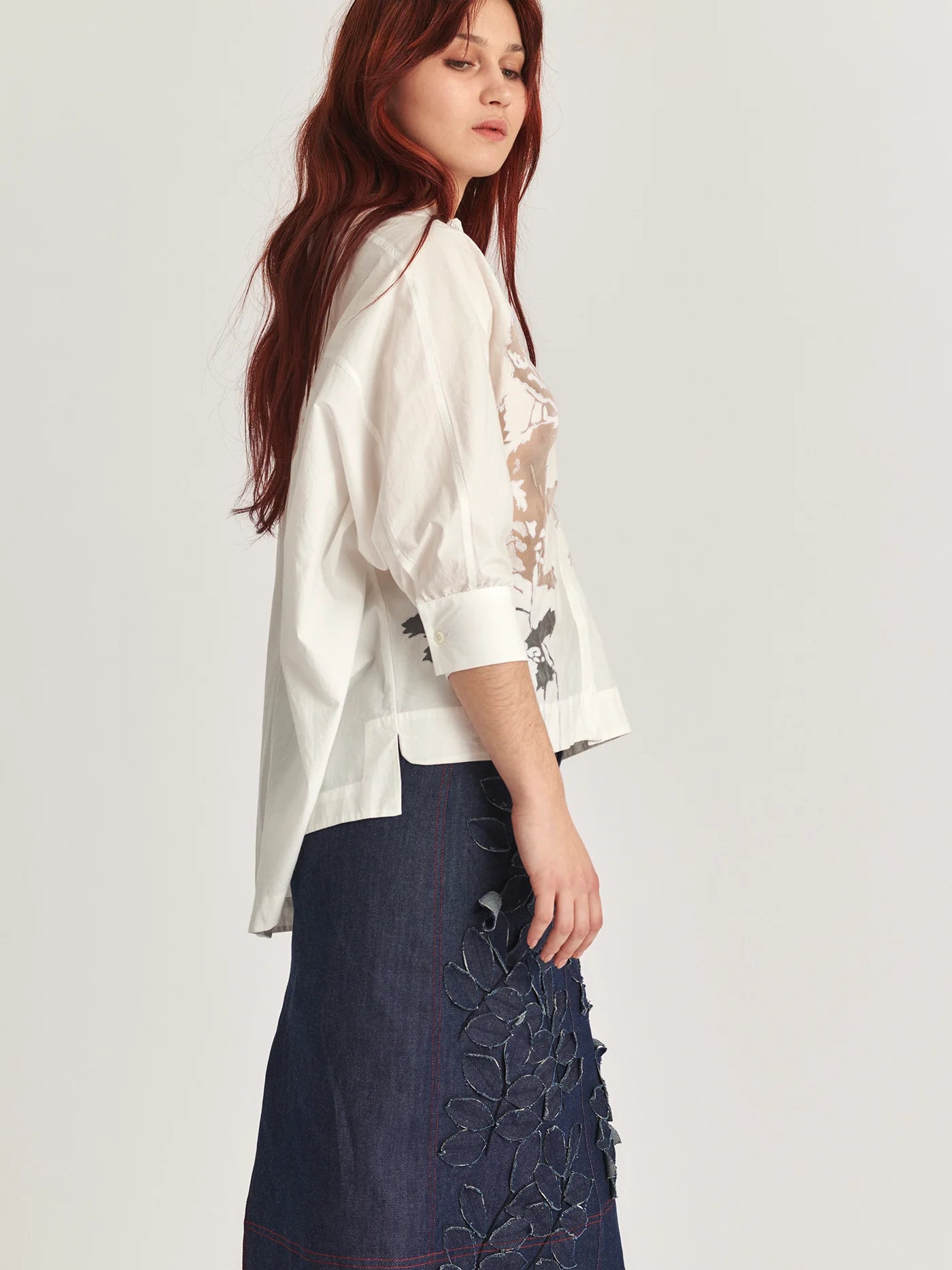 The Gauri shirt is an exceptional piece. In keeping with the idea of light and shade, we wanted to combine transparency with opacity. Using a technique of cutting and inlaying silk organza on cotton poplin, we were able to draw foliage into the very heart of the piece.