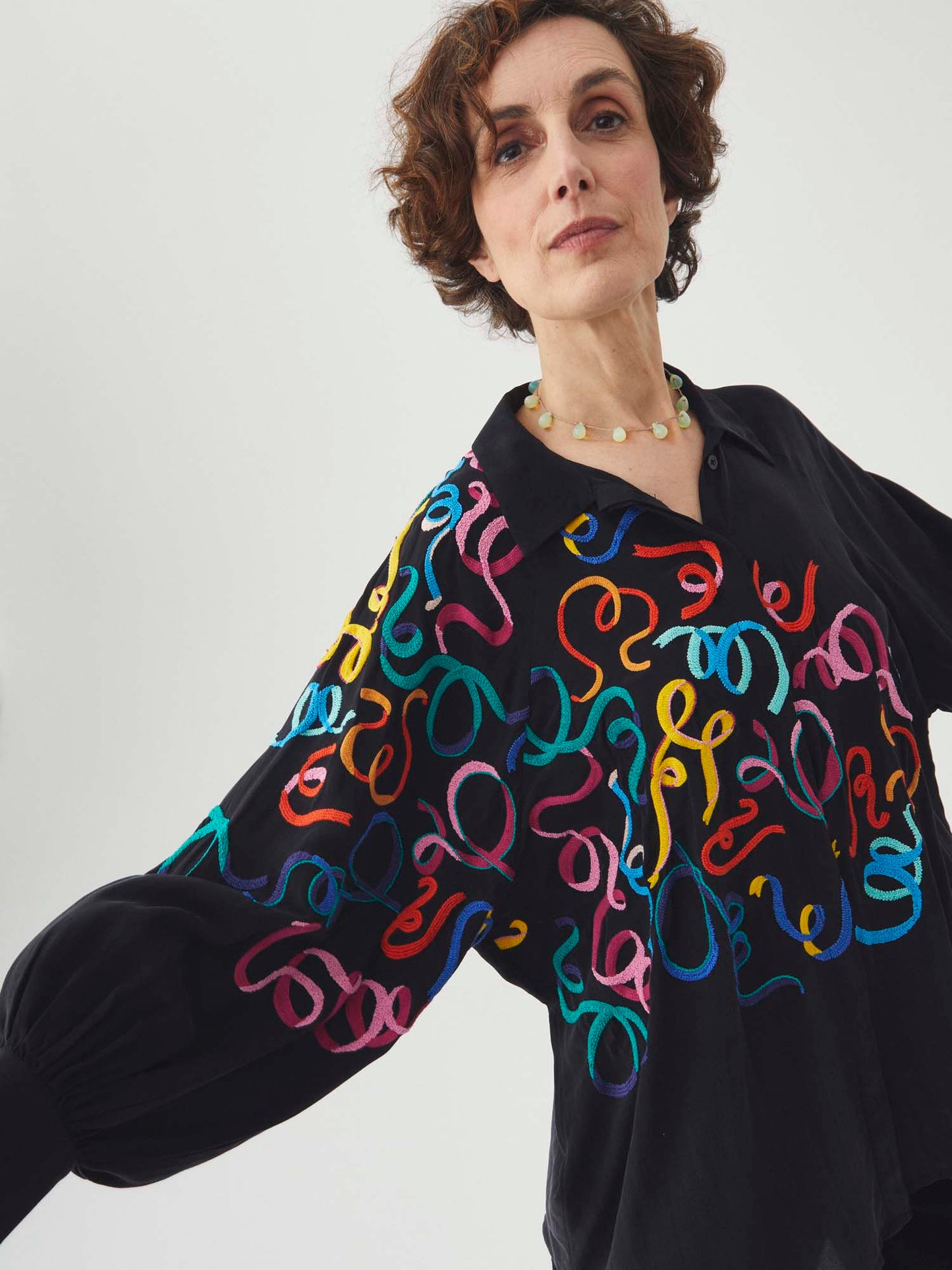 2023 marks the 10th anniversary of mii. For this anniversary year, we are adorning our oversized Lulu tunic with a shower of serpentins. Entirely hand-embroidered on soft, lightweight silk, these embroideries testify to the technical skill of our embroiderers. Variations in thread colors evoke a party in full swing, with a multitude of serpentins just bursting into the air. Why not join la fête ?