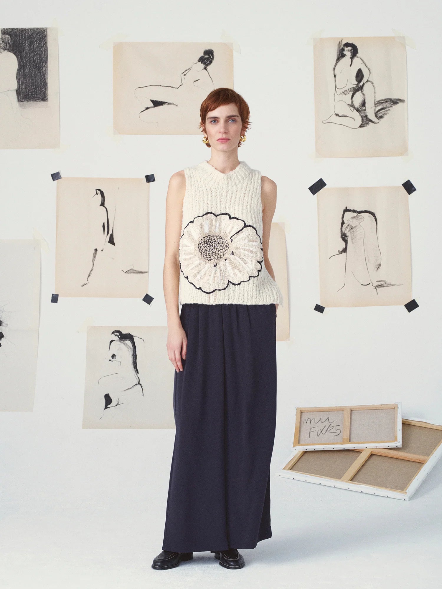 Our daisy takes center stage this winter on a hand-knitted cropped sweater. Hand-embroidered, the daisy has been crafted in softer white tones. A winter version of our Maya Marguerite sweater from winter 2024. The collar is slightly high and the sweater features openwork on the sides.