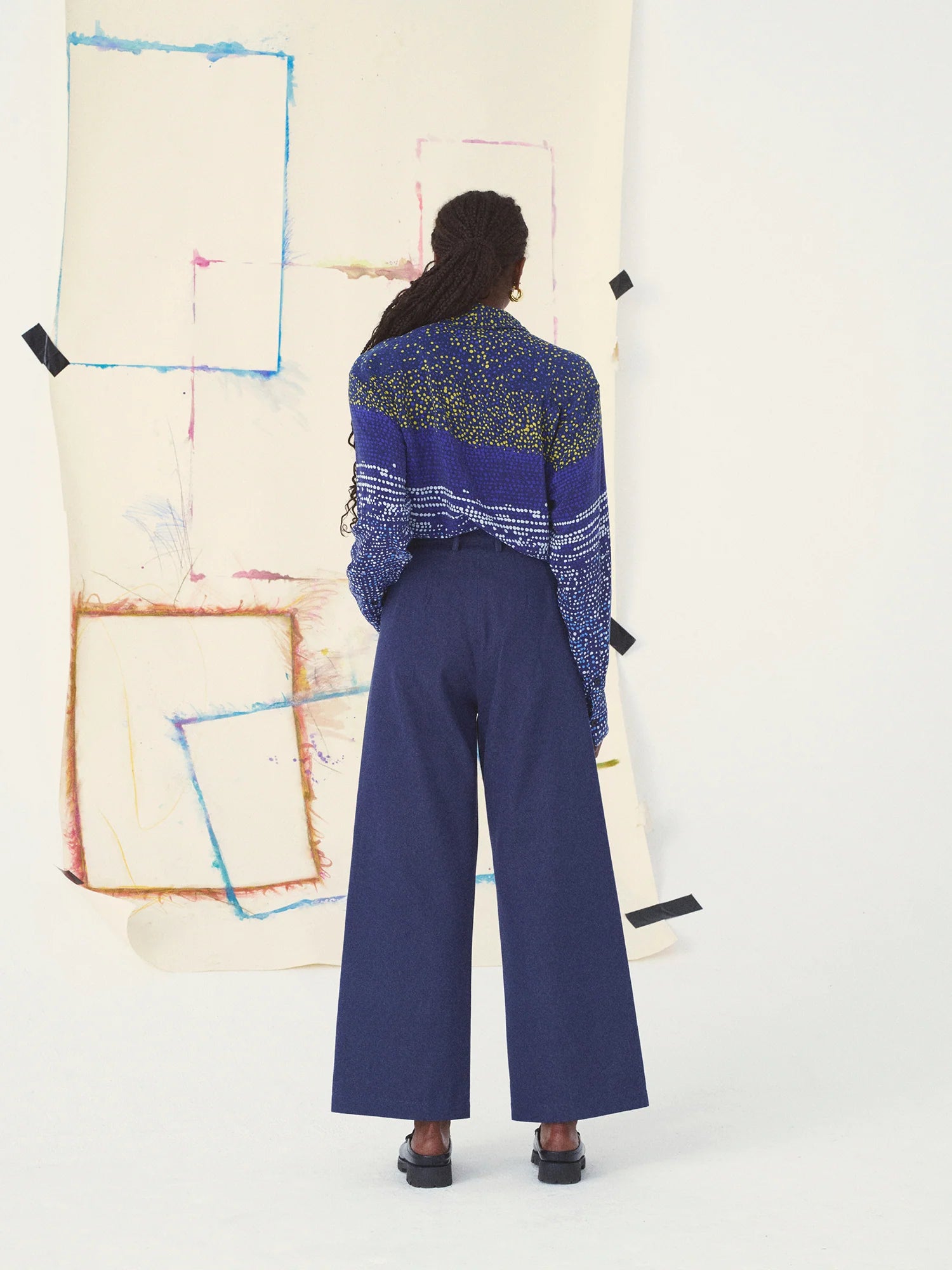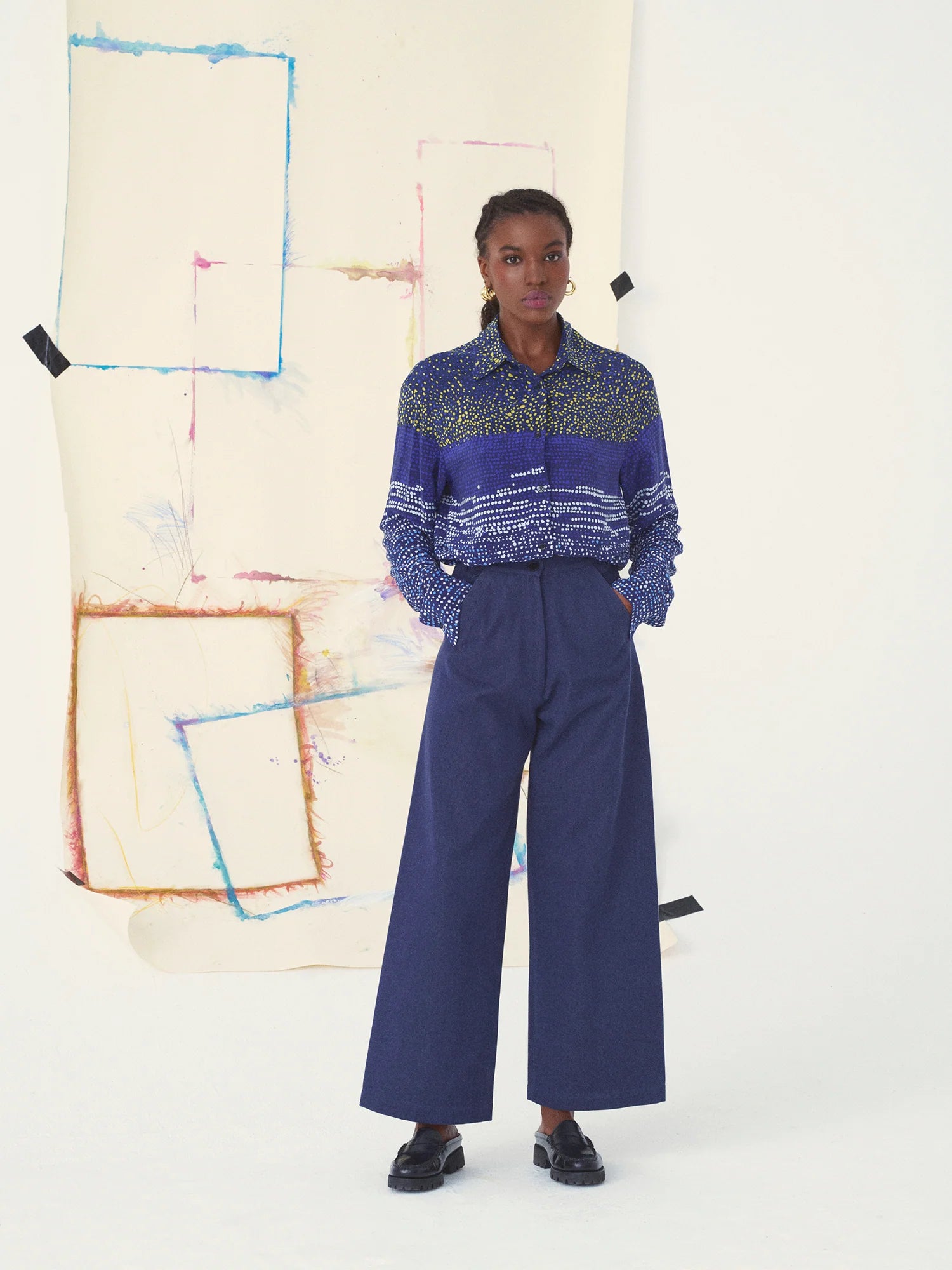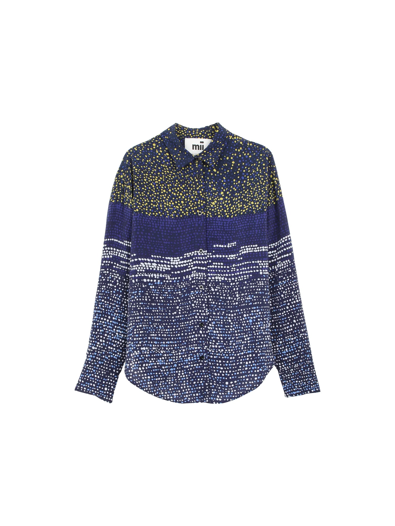 The Milou shirt is made of silk and is part of the Impressionist theme. It features a seascape print, worked using the technique of the 19th-century Impressionists. The colors are at the center of the piece and fade quickly, almost blurring the lines. The landscape is available in two colorways: a daytime version and a nighttime version. The print was handmade in our workshop in India, using the screen printing technique. Each color corresponds to a unique frame, made especially for this motif.