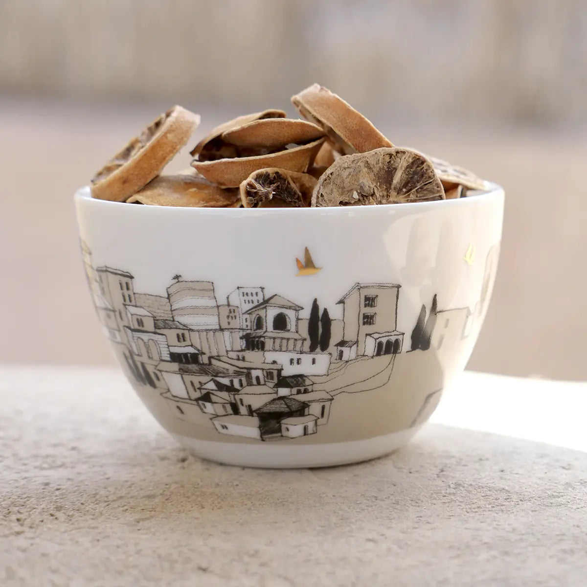 Introducing the Set of 2 Naseem Condiment Bowls, a collaboration masterpiece by Jordanian architect Randa Haddadin. Crafted from porcelain, each bowl showcases scenes inspired by the region's natural beauty, blending winding alleyways, traditional squares, camels, and palm trees. Adorned with meticulous 22-karat gold detailing, these bowls promise to elevate your space with extraordinary elegance. Whether for entertaining or as a thoughtful gift, they mark you out as a curator of cultural richness and timeless style.