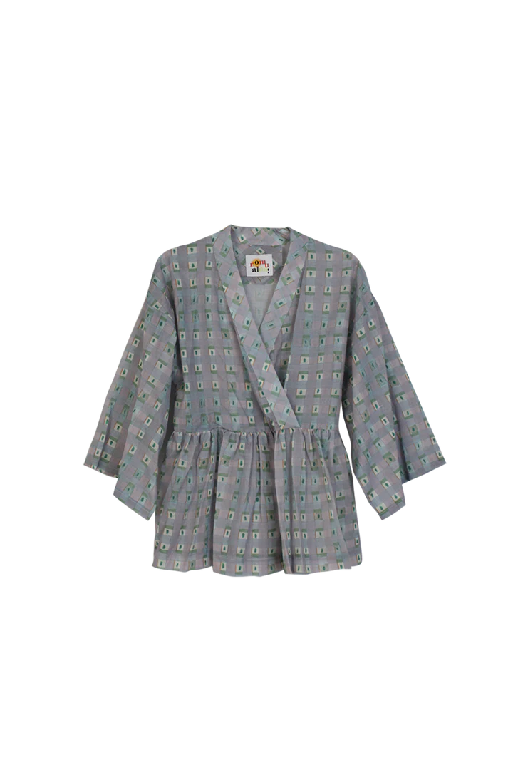 Whimsical cotton-linen tunic with wide sleeves, a kimono-style wrap neckline and high waist.