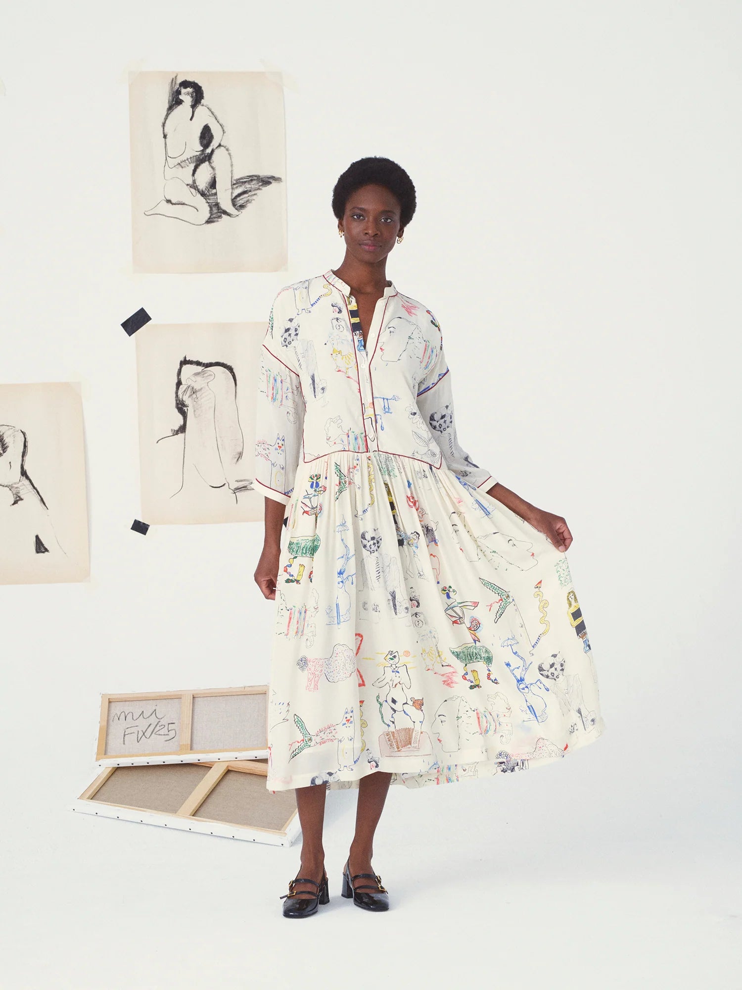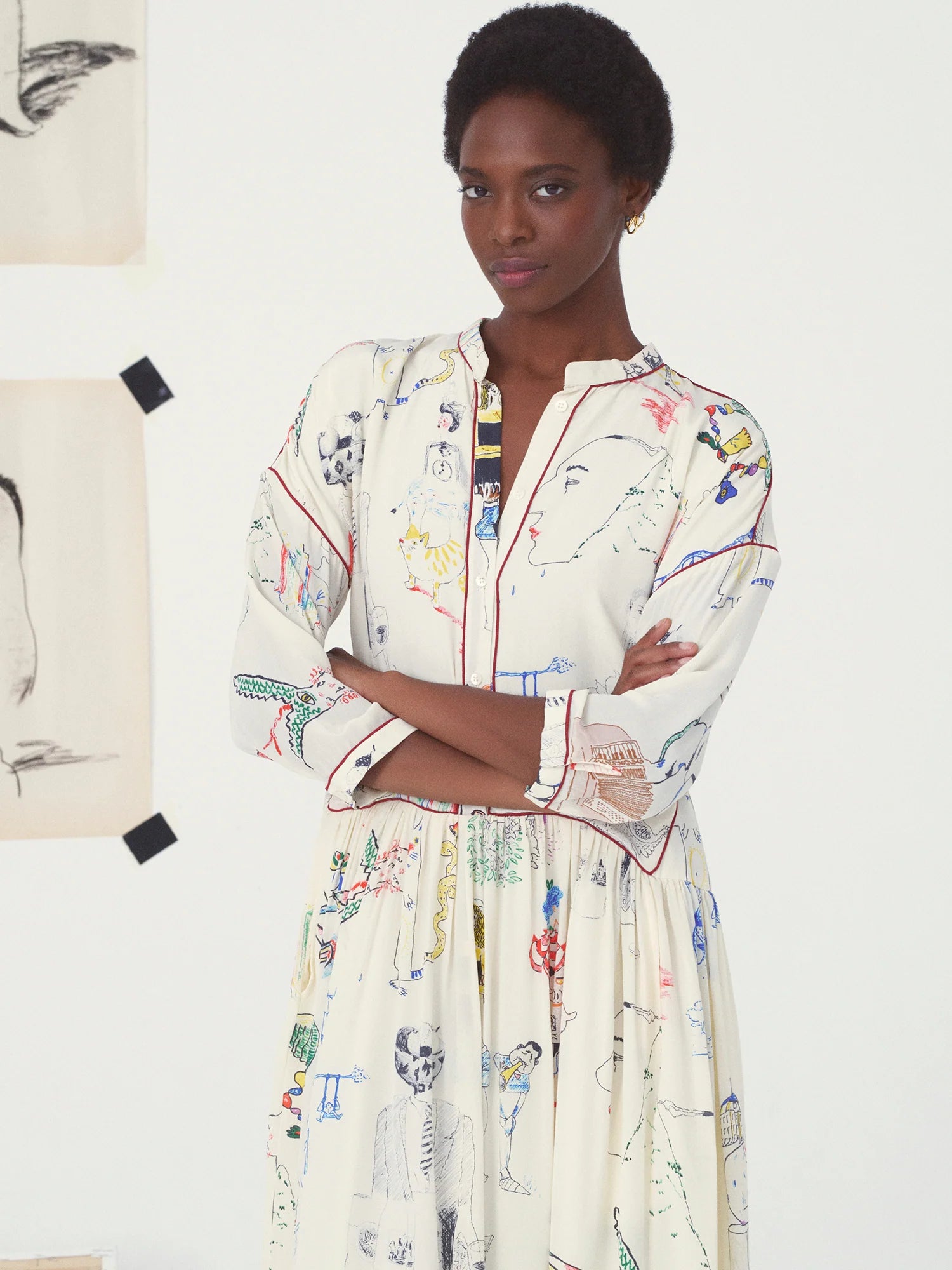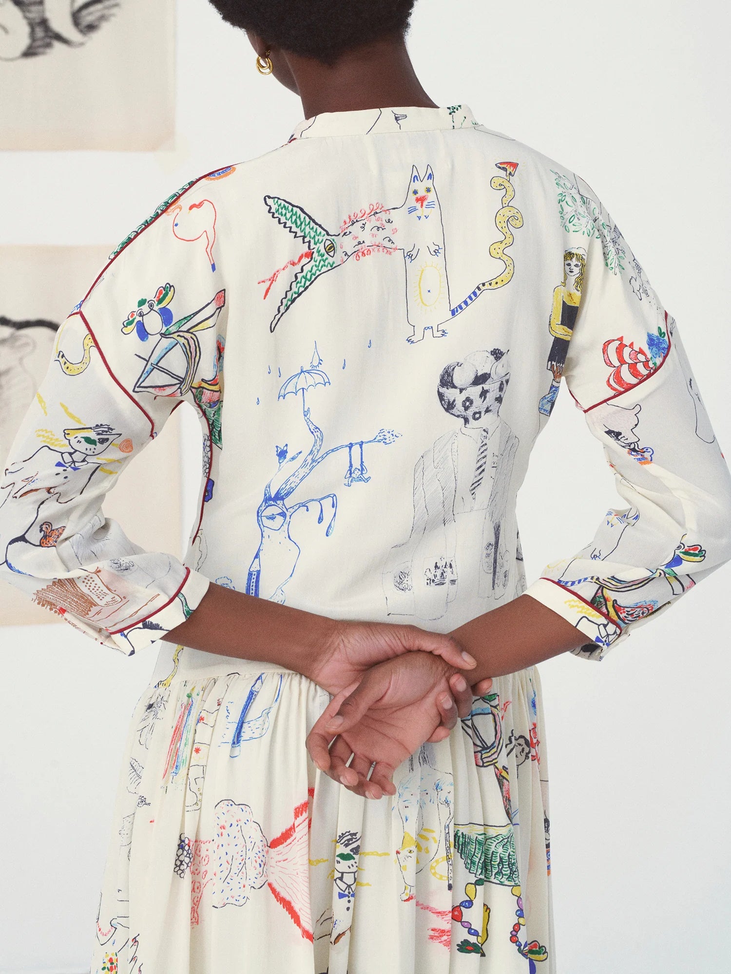 The Nour model is one of this season's new pieces. It's actually one of our older designs: the Tara dress. The model has been completely reworked and modernized. The dress is narrower and the waist has been redesigned. A modern piece, adaptable to all body shapes, which features the season's motif: the exquisite corpse in high-quality silk. The top of the dress is straight, then flares out thanks to a play of pleats. A pretty red border enhances this print and gives it a lot of style.
